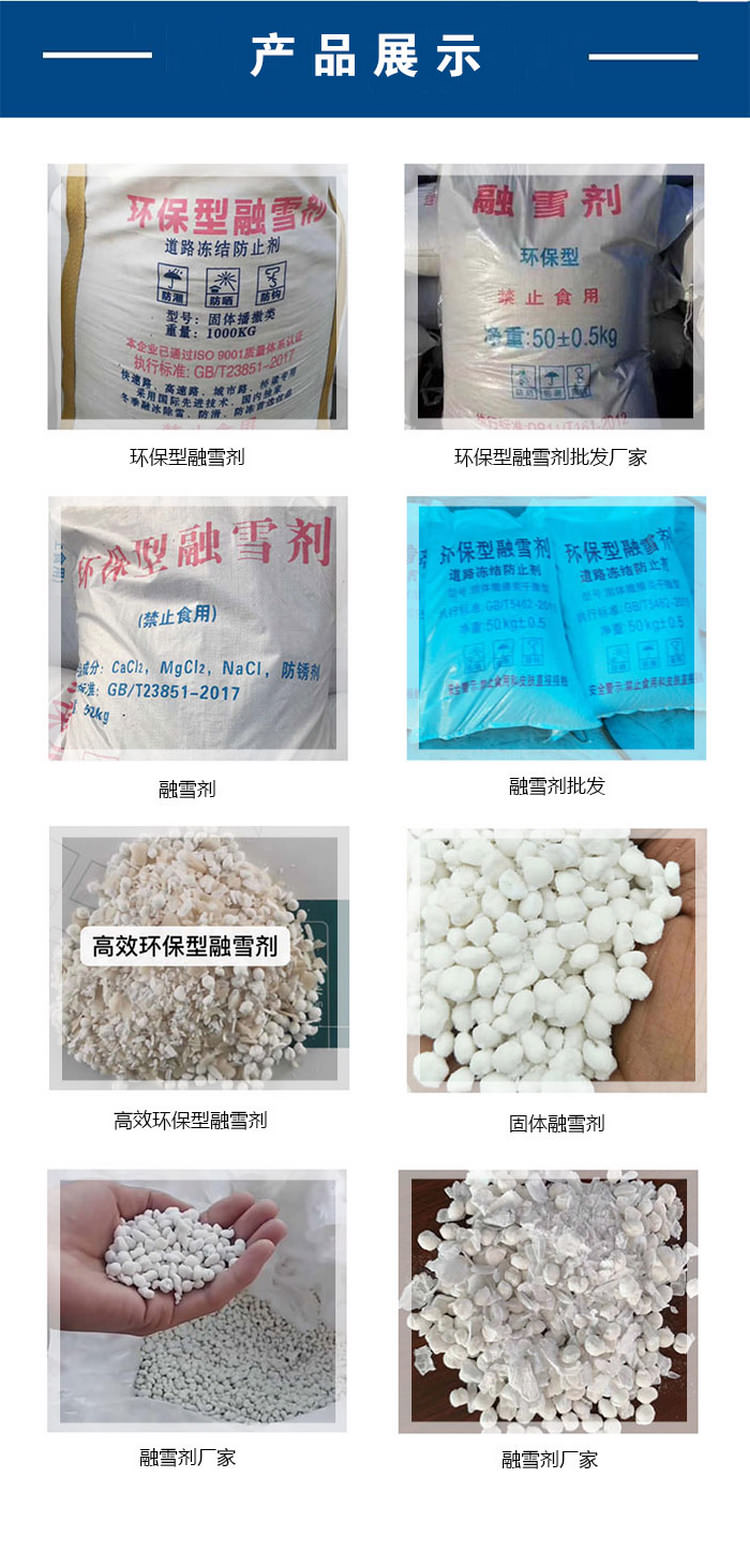 在公路,橋梁,金屬設(shè)施,路面,地面建筑棚架,工廠,學(xué)校,醫(yī)院,停車場等地方清除積雪和結(jié)冰。融雪不傷害物體,不污染環(huán)境,是一種高效環(huán)保物質(zhì)。